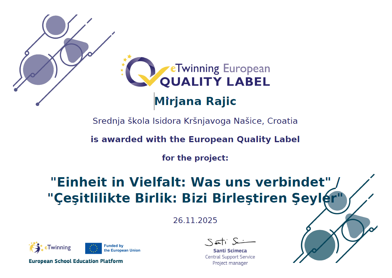 Raspored sati Detaljnije Obilježavamo Mjesec kibernetičke sigurnostiSavjeti, ankete, edukativni sadržaji, nagradni kvizovi… Pridružite nam se... učenika Razredna odjela Djelatnika Obrazovnih programa Europska oznaka kvalitete za dva eTwinning projekta naše škole by Sanja Kurucić | 8. prosinca 2025. | eTwinning novosti, Vijesti | 0 Comments Više... Javni poziv za izvanučioničku nastavu – ponuda broj 6/2025 by Barbara Knežević | 8. prosinca 2025. | Javni pozivi za izvanučioničku nastavu | 0 Comments Više... Dobitnici nagrade za volonterski doprinos našeg školskog volonterskog kluba by Sanja Kurucić | 8. prosinca 2025. | Vijesti | 0 Comments Više... Održano županijsko natjecanje u stolnom tenisu te izboren odlazak na državnu razinu natjecanja by Sanja Kurucić | 8. prosinca 2025. | Vijesti | 0 Comments Više... Plasman na državno natjecanje u šahu by Sanja Kurucić | 8. prosinca 2025. | Vijesti | 0 Comments Više... Rezultati odabira – ponuda broj 2/2025 by Barbara Knežević | 4. prosinca 2025. | Javni pozivi za izvanučioničku nastavu | 0 Comments Više... Rezultati odabira – ponuda broj 3/2025 by Barbara Knežević | 4. prosinca 2025. | Javni pozivi za izvanučioničku nastavu | 0 Comments Više... Centar izvrsnosti – održana prva radionica by Barbara Knežević | 1. prosinca 2025. | Vijesti | 0 Comments Više... Ponuda broj 1/2025 – rezultati odabira by Barbara Knežević | 1. prosinca 2025. | Javni pozivi za izvanučioničku nastavu | 0 Comments Više... Izazov Dabar – 10 učenika plasiralo se u 10% najboljih by Barbara Knežević | 28. studenoga 2025. | Vijesti | 0 Comments Više... Javni poziv za izvanučioničku nastavu – ponuda broj 5 by Barbara Knežević | 28. studenoga 2025. | Javni pozivi za izvanučioničku nastavu | 0 Comments Više... Stručni skup nastavnika matematike – Županijsko stručno vijeće Osječko-baranjske županije (zapad) i Virovitičko-podravske županije by Manuela Kojić | 27. studenoga 2025. | Vijesti | 0 Comments Više... Lista kandidata za razgovor – operativni djelatnik za sigurnost i zaštitu by Barbara Knežević | 27. studenoga 2025. | Natječaji za posao | 0 Comments Više... Učenice naše škole sudjelovale na Erasmus mobilnosti u Martanu, Italija by Manuela Kojić | 26. studenoga 2025. | Erasmus i EPAS, Vijesti | 0 Comments Više... Obilježili smo Međunarodni dan borbe protiv nasilja nad ženama by Manuela Kojić | 26. studenoga 2025. | Vijesti | 0 Comments Više... Raspored Završni rad Državna matura Centar izvrsnosti Učenička zadruga Isidora Školski godišnjak 23./24. Uz spomenicu… Školski digitalni list