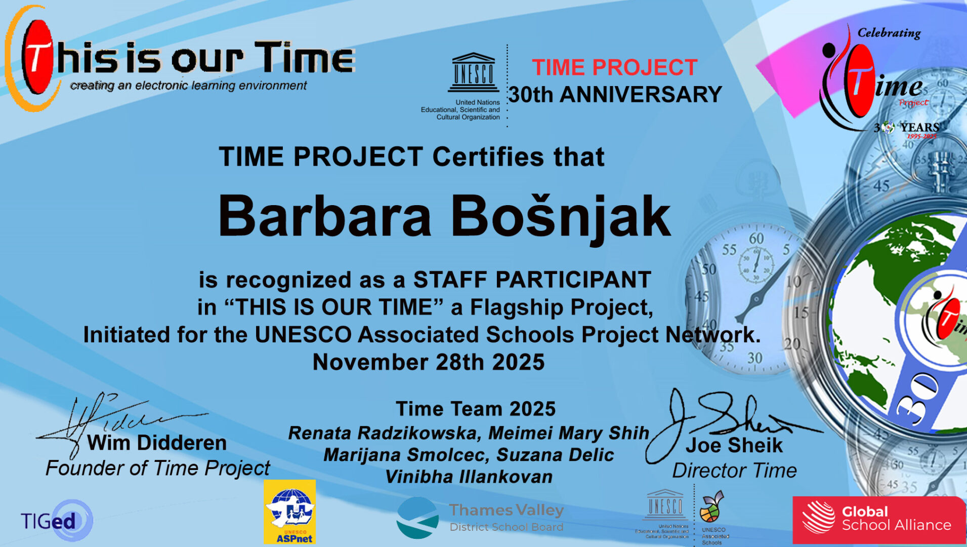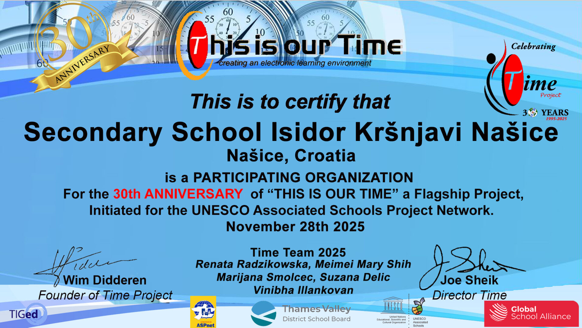 „This is our Time“ je dinamičan, višejezičan i interkulturalan globalni komunikacijski projekt za osnovne i srednje škole, pokrenut i razvijen u suradnji s UNESCO-ovom Mrežom udruženih škola (ASPnet). Ovaj projekt izvorno je pokrenut 16. studenoga 1995. povodom obilježavanja 50. obljetnice UN-a i UNESCO-a.