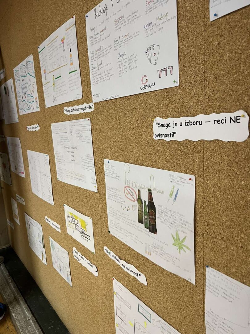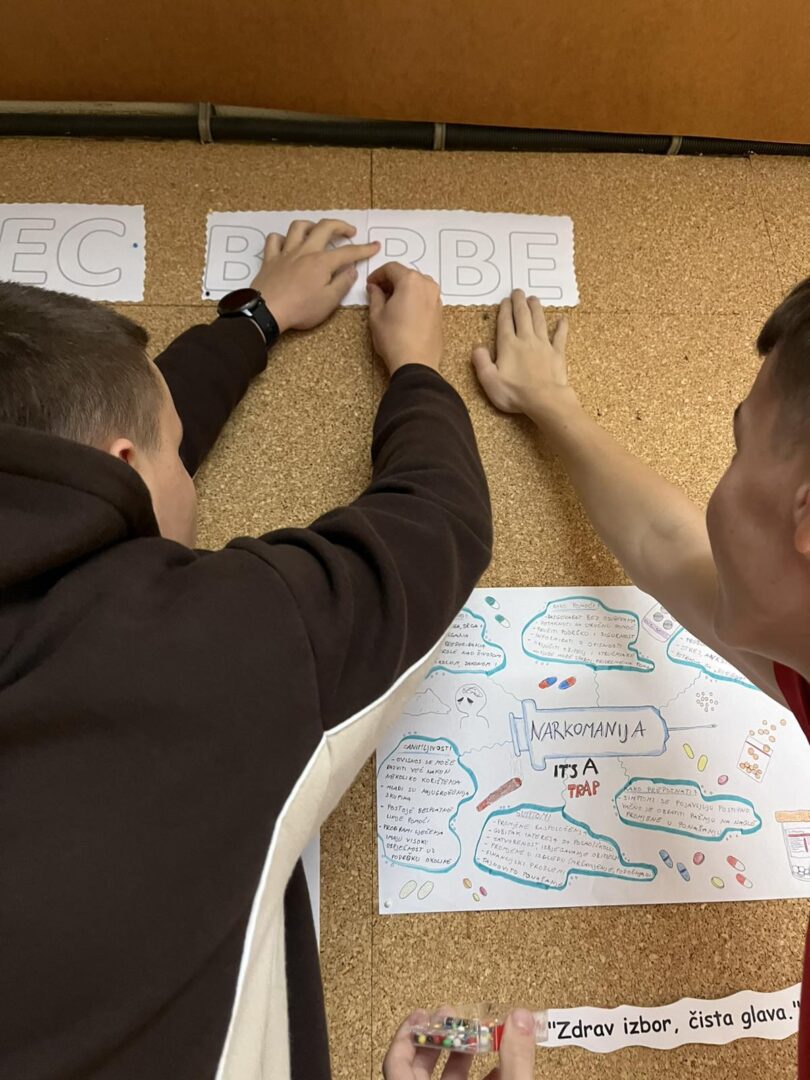 Povodom Mjeseca borbe protiv ovisnosti, naši su učenici vrijedno istraživali teme koje ih izravno okružuju: od nikotina i alkohola do digitalnih i emocionalnih ovisnosti. Rad u parovima omogućio im je da zajedno prouče uzroke, rizike, znakove prepoznavanja i načine prevencije raznih ovisnosti te sve to predstave u obliku kreativnih plakata. Kroz kolaže, umne mape i vizualne poruke učenici su pokazali razumijevanje, ozbiljnost i zrelost u pristupu temi.