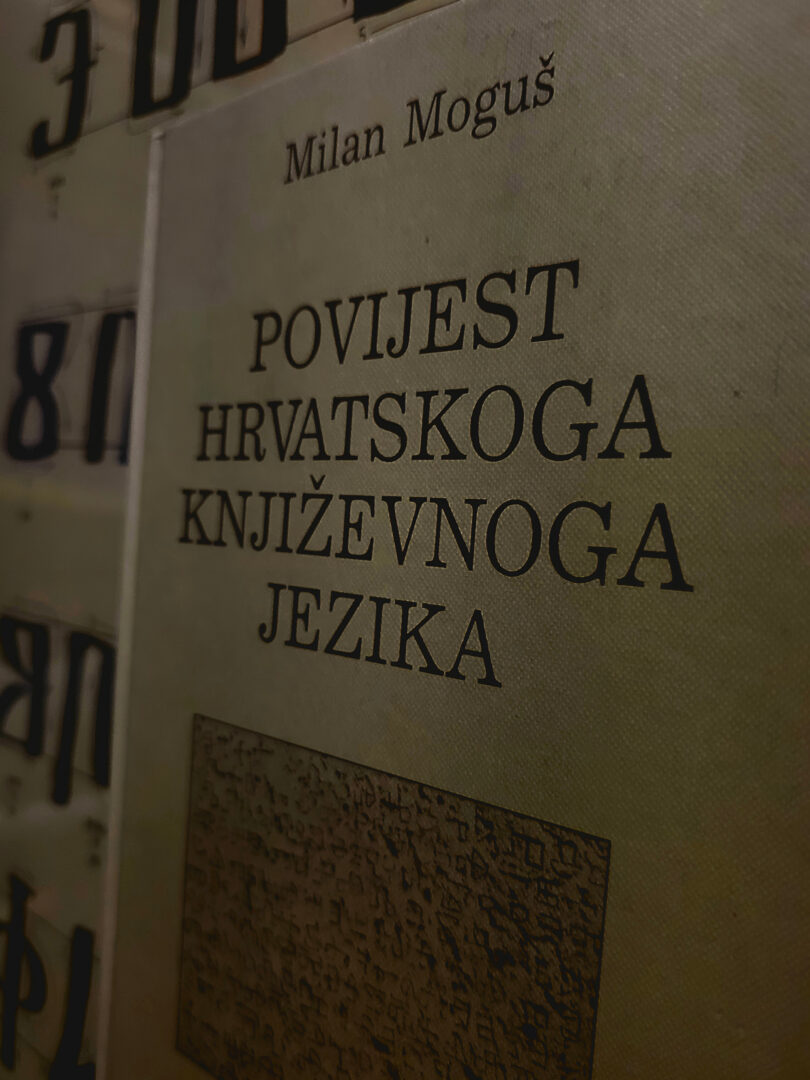 Fotografiju sam snimio s mobitelom u Gradskoj knjižnici u Našicama. Na fotografiji sam prikazao neke od najznačajnijih pisaca hrvatske književnosti te njihova djela. S tehničkog aspekta fotografija sadrži troslojnu kompoziciju koja se sastoji od prednjeg plana, srednjeg plana i pozadine.